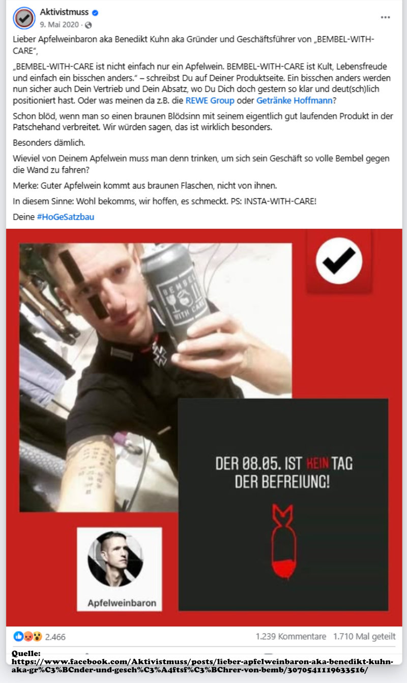 Daran zeigt sich, dass Benedikt Kuhn seine Apfelweinmarke in der Vergangenheit nicht rechts positioniert hatte. Vielmehr trat er für Meinungsfreiheit ein, wie die Anwesenheit eines Antifa-Standes auf einem vom ihm organisierten Festival belegt. Statt vor diesem Hintergrund einen Dialog zu suchen, wurde Veronika Kracher gegen Benedikt Kuhn ausfällig. Im Jahr darauf wurde sie bei der Amadeu-Antonio-Stiftung angestellt.