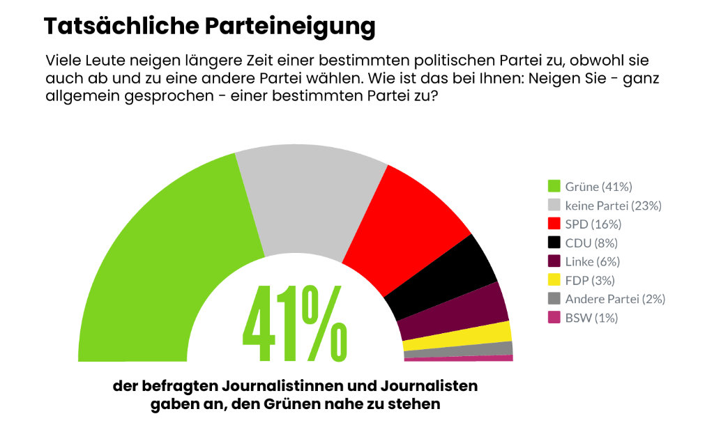 Laut einer Studie der Technischen Universität Dortmund haben 63% der Journalisten eine grün-rot-tiefrote Parteipräferenz, wohingegen nur 8% der CDU zugeneigt sind.