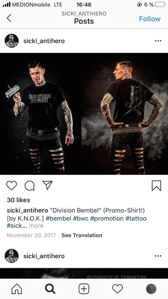 Wohlgemerkt das Motiv des T-Shirts stammte nicht von Benedikt Kuhn selbst, es wurde ihm lediglich über Kontaktschuld zur Last gelegt. Im Übrigen habe ich im vorigen Artikel bereits dargelegt, wie die Schwarze Szene mit derlei ideologiefrei kokettiert.